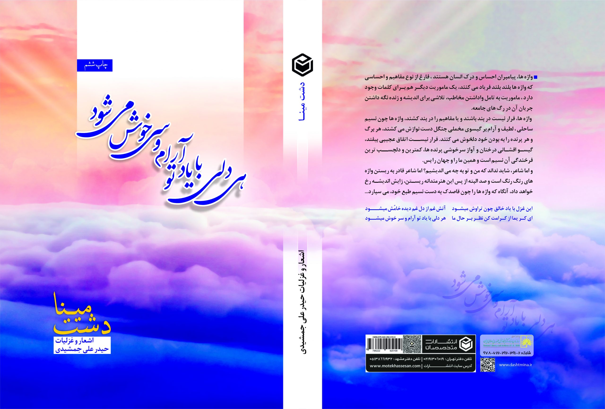 مجموعه غزلیات دشت مینا ، مجموعه اشعار شاعر معاصر حیدر علی جمشیدی، روزگار سعادتمندی برای شما فرهنگ دوستان ادب دوست آرزو می کند.لطفا چنانچه در بازدید از وب سایت دشت مینا حال خوشی به شما دست داد ، آن را به سایر فرهنگ دوستان و علاقمندان شعر و ادب پارسی نیز معرفی کنید. در زمانه ای که نیاز به شادی و حال خوش به شدت احساس می شود ، با برداشتن گامی هر چند کوچک، برای ایجاد حس و حال خوب در دیگران سهیم باشیم.سپاس از همدلی و همراهی شما.مجموعه دشت مینا